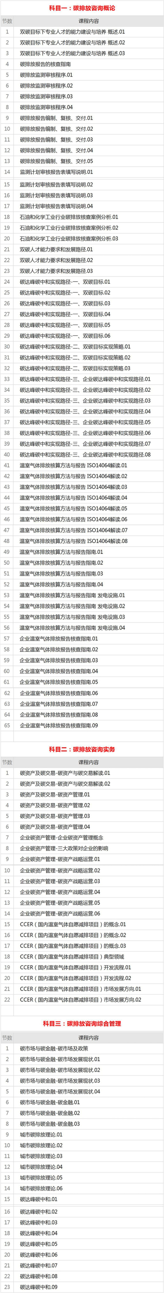 一、碳排放咨询培训系列课程分为:《碳排放咨询概论》、《碳排放咨询实务》、《碳排放咨询综合管理》三个科目学习内容。