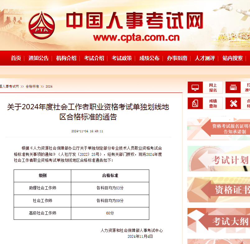 根据《人力资源社会保障部办公厅关于单独划定部分专业技术人员职业资格考试合格标准有关事项的通知》(人社厅发﹝2022﹞25号),经有关部门授权,现将2024年度社会工作者职业资格考试单独划线地区合格标准通告如下: