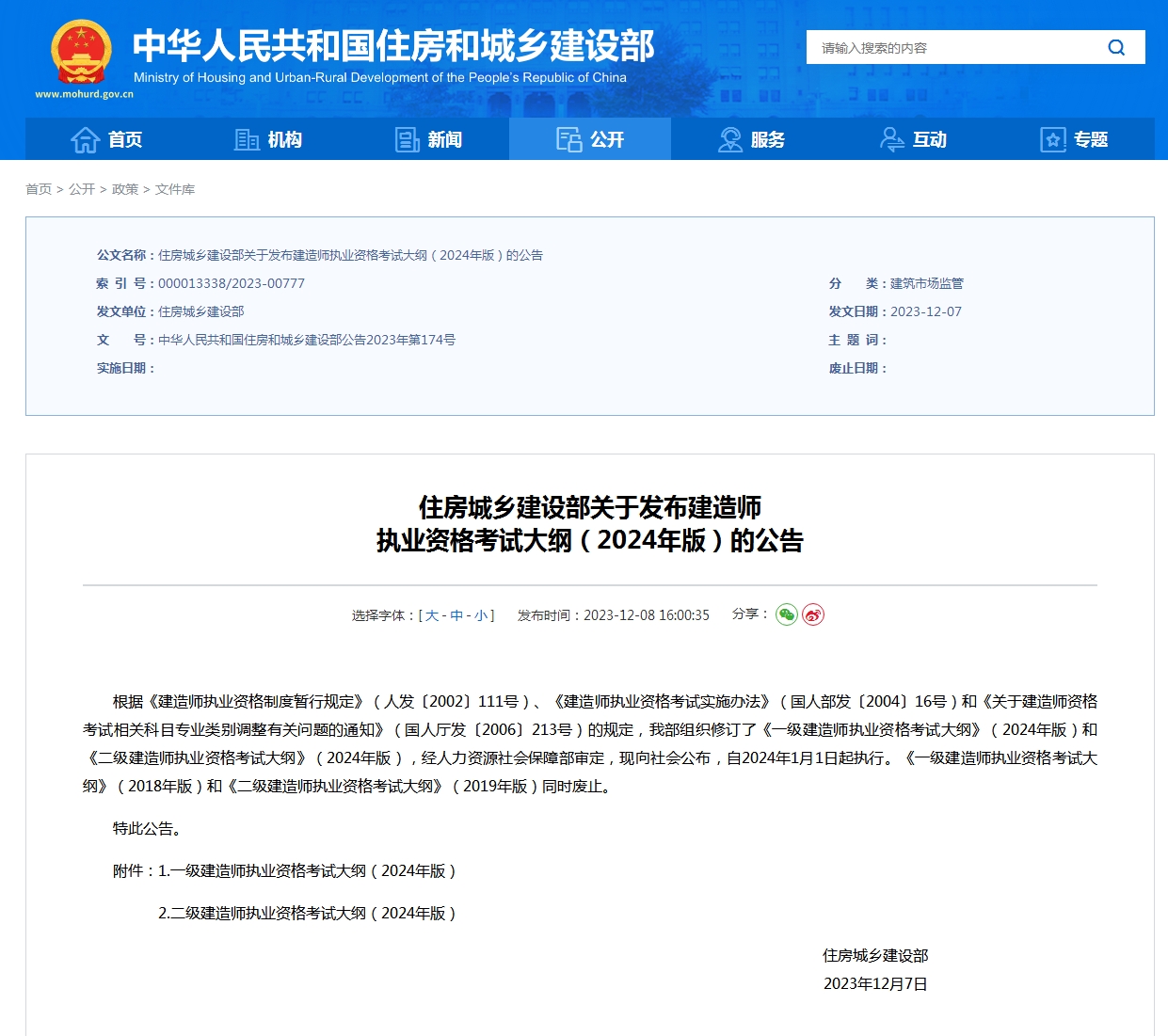 住房城乡建设部关于发布建造师执业资格考试大纲(2024年版)的公告