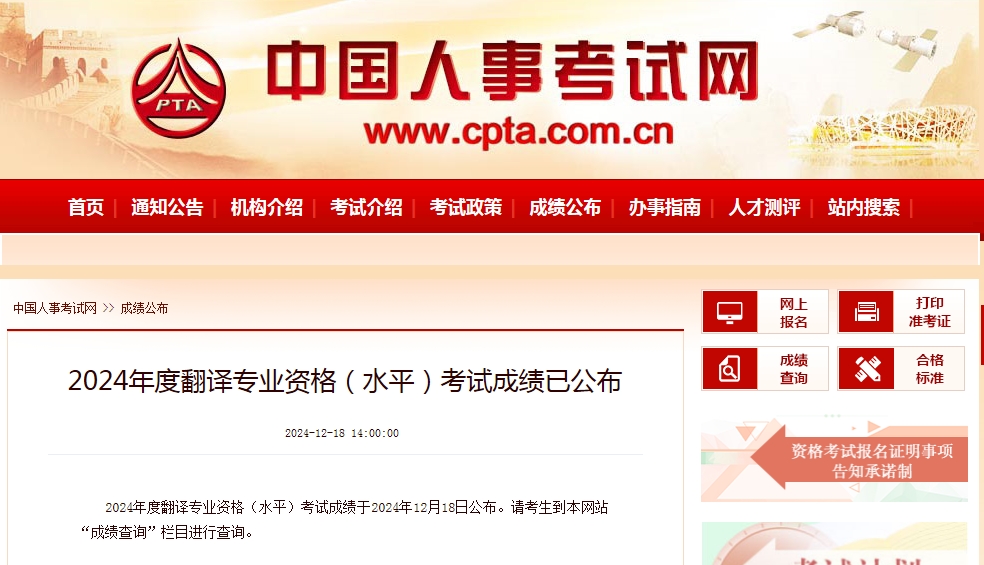 中国人事考试网于2024年12月18日公布“翻译专业资格(水平)考试成绩"!考生们速来查分了!