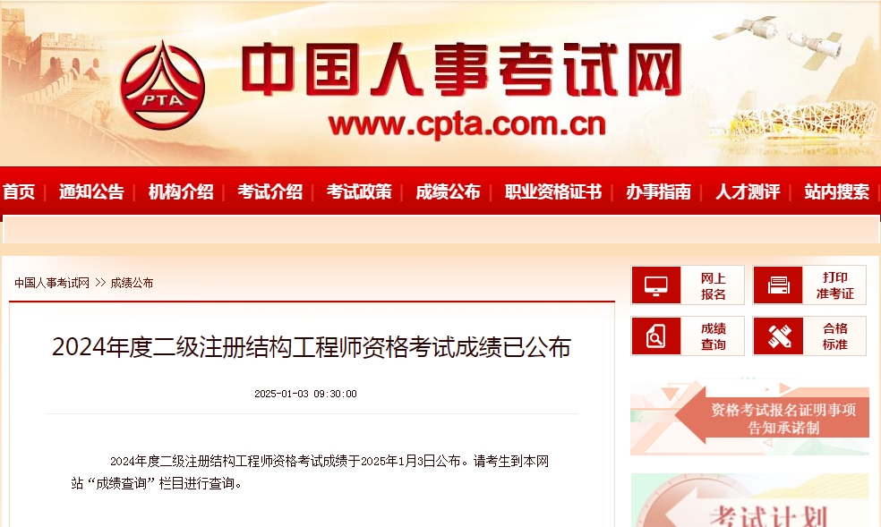 中国人事考试网于2025年1月3日公布“二级注册结构工程师资格考试成绩已公布"!考生们速来查分了!
