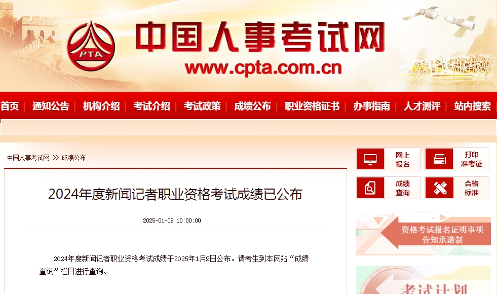 中国人事考试网于2025年1月9日公布“新闻记者职业资格考试成绩已公布"!考生们速来查分了!