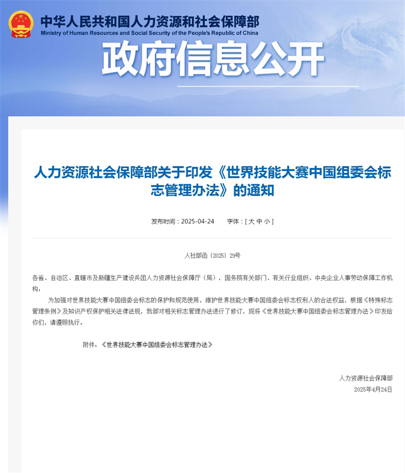 人力资源社会保障部关于印发《世界技能大赛中国组委会标志管理办法》的通知