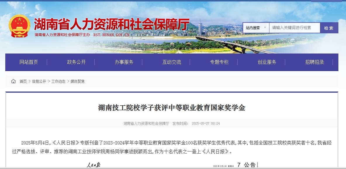 2025年5月4日,《人民日报》专版刊登了2023-2024学年中等职业教育国家奖学金100名获奖学生优秀代表,其中,包括全国技工院校类获奖者十名,我省经过严格选拔、评审、推荐的湖南工业技师学院周杨同学事迹脱颖而出,作为十名代表之一登上《人民日报》。