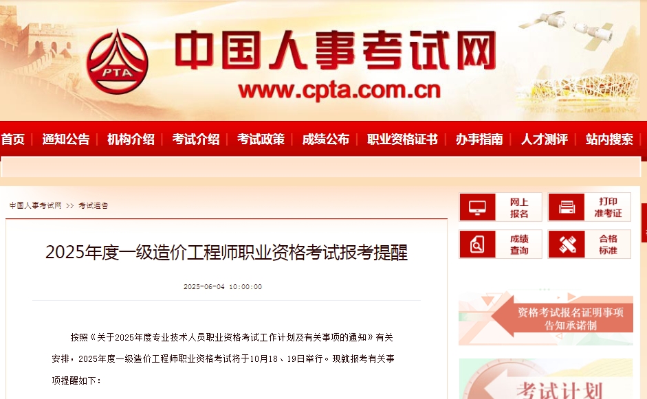 2025 年度一级造价工程师职业资格考试报名与考试时间通知