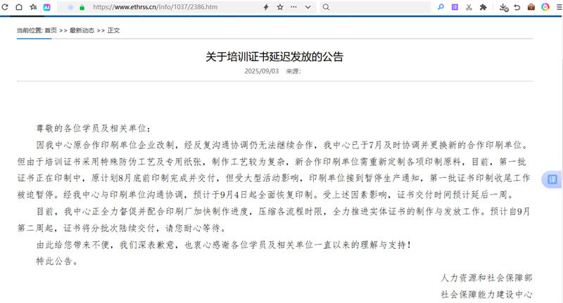 人力资源和社会保障部 社会保障能力建设中心:关于培训证书延迟发放的公告