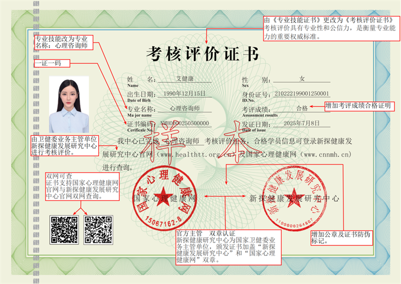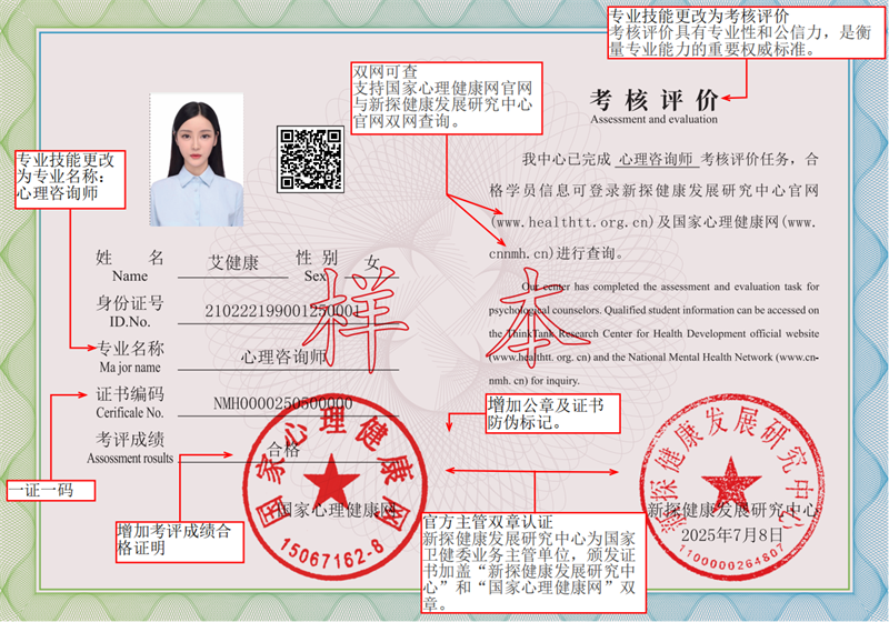 新版证书将加盖卫健委主管的“新探健康发展研究中心印”章,形成“双章证书,双网查询”,增强证书的权威性与可查性。