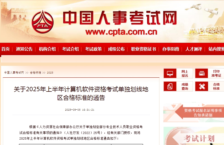 原文跳转:关于2025年上半年计算机软件资格考试单独划线地区合格标准的通告