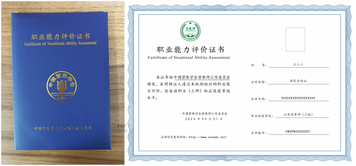 公共营养师证书由中国营养学会颁发,证书上包含持证人的个人信息、专业技能级别、发证机构等关键信息。证书的封面设计庄重,体现了证书的权威性。该证书是公共营养师专业能力的象征,对于持证人来说,不仅可以提升自己在营养领域的专业形象,还能为其在就业市场上增加竞争力,有助于获得更好的职业发展机会,如在食品企业、健身中心等机构担任重要职位。