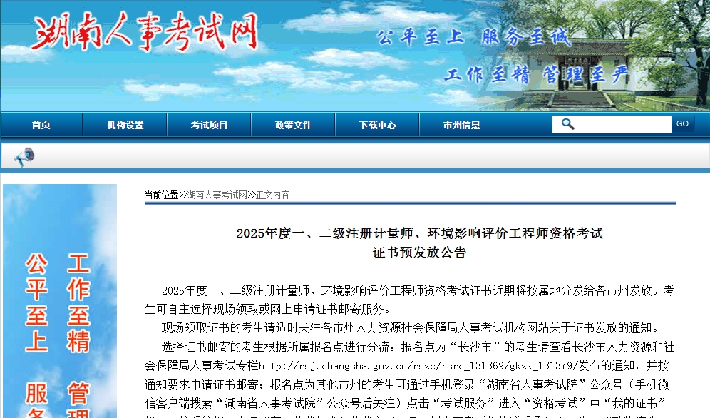 湖南省2025年一、二级注册计量师、环境影响评价工程师资格考试 证书预发放通知