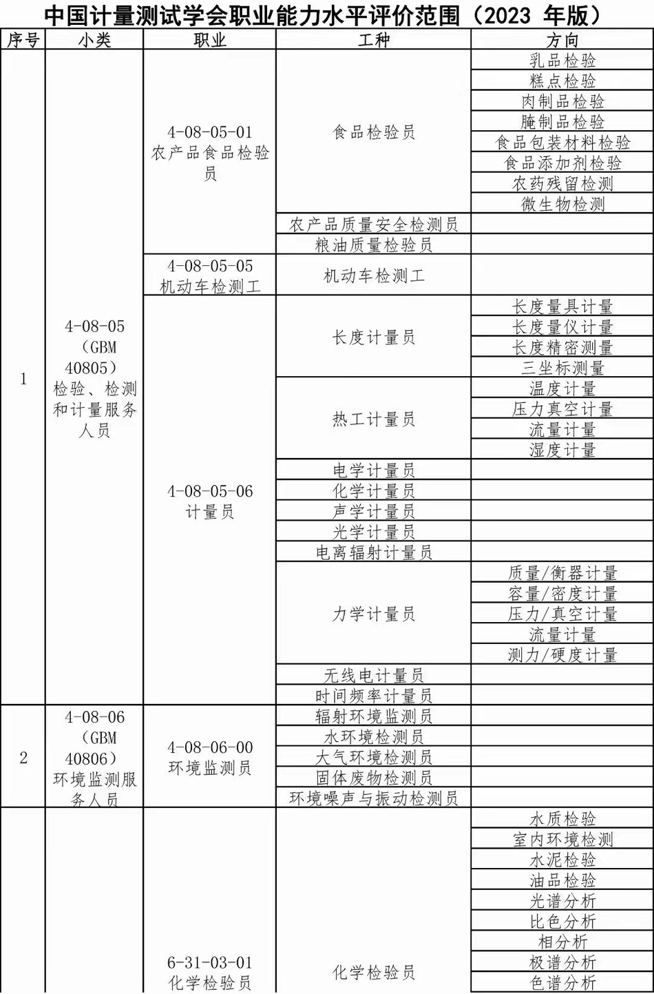 中国计量测试学会:食品检验员、农产品质量安全检测员、粮油质量检验员、长度计量员、热工计量员、电学计量员、化学计量员、声学计量员、光学计量员、电离辐射计量员、力学计量员、无线电计量员、时间频率计量员、化学检验员、材料物理性能检验员、无损检测员、质检员、试验员、机动车检测工、环境监测员等职业能力证书报考说明
