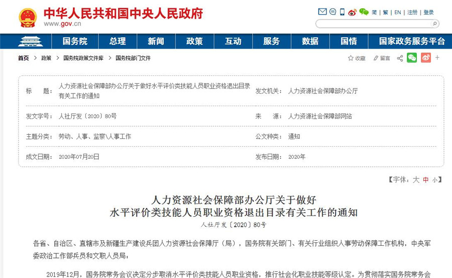 1、《人力资源社会保障部办公厅关于做好水平评价类技能人员职业资格退出目录有关工作的通知》