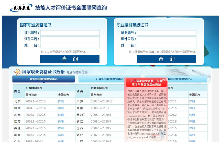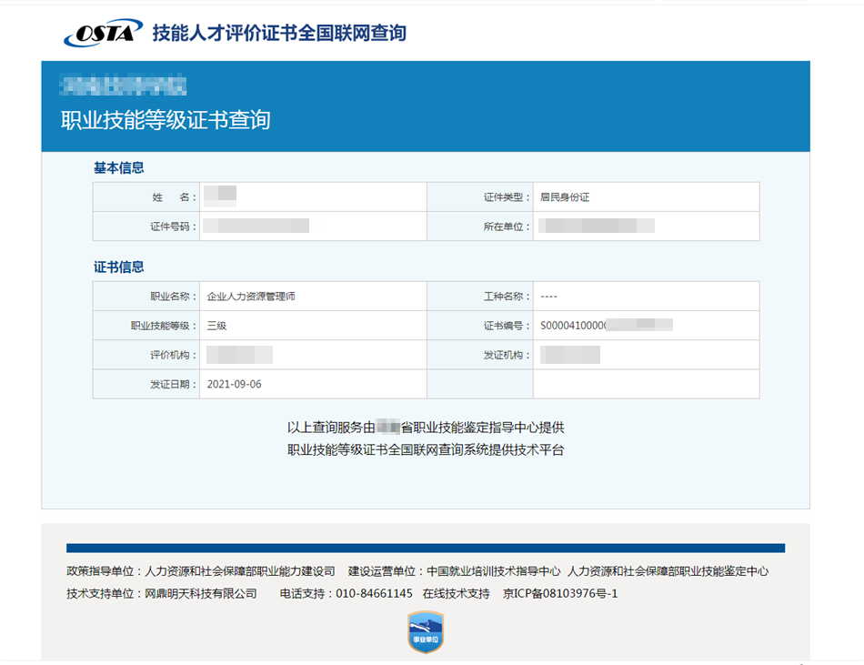 职业技能等级证书:技能人才评价证书全国联网查询查询截图