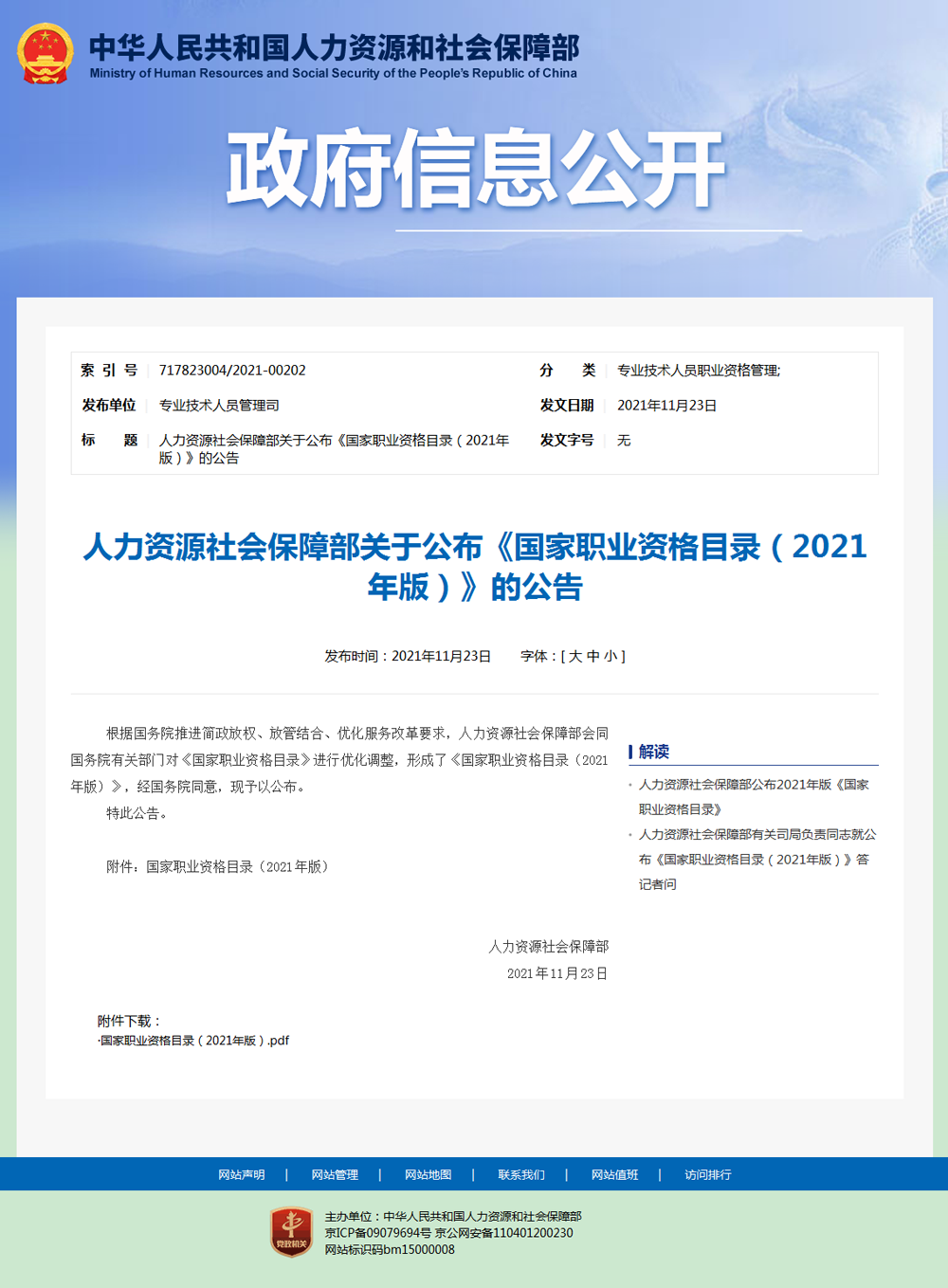 根据国务院推进简政放权、放管结合、优化服务改革要求,人力资源社会保障部会同国务院有关部门对《国家职业资格目录》进行优化调整,形成了《国家职业资格目录(2021年版)》,经国务院同意,现予以公布。