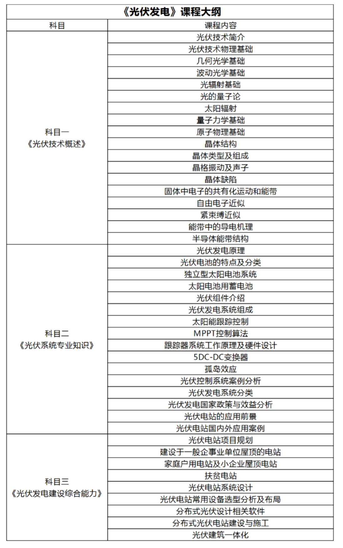 (三) 光伏发电(高级):必修科目:《光伏技术概述》、《光伏系统专业知识》、《光伏发电专业知识》。共94课时。