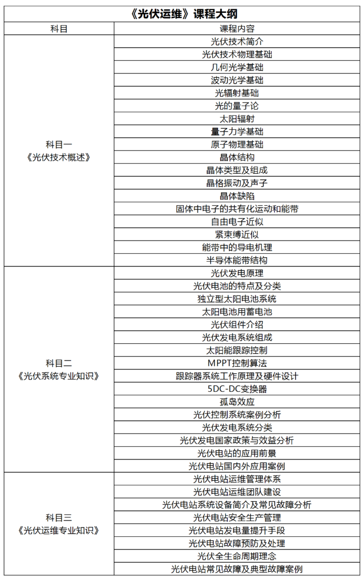 一、新能源领域光伏运维培训系列课程分为:《光伏技术概述》、《光伏系统专业知识》、《光伏运维专业知识》三个科目学习内容。