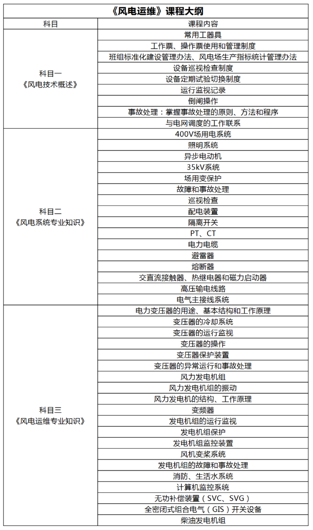 《风电技术概述》、《风电系统专业知识》、《风电运维专业知识》三个科目学习内容。