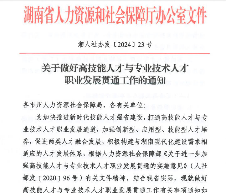 为加快推进新时代技能人才强省建设,打通高技能人才与专业技术人才职业发展通道,加强创新型、应用型、技能型人才培养,促进两类人才融合发展,积极构建与湖南现代化建设需求相适应的人才发展体系,根据人力资源社会保障部《关于进一步加强高技能人才与专业技术人才职业发展贯通的实施意见》(人社部发[2020]96号)有关文件精神,结合我省实际,现就做好高技能人才与专业技术人才职业发展贯通工作有关事项通知如下: