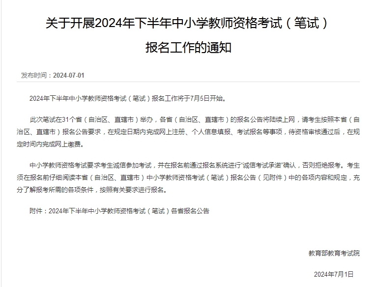 2024年下半年中小学教师资格考试(笔试)报名工作将于7月5日开始。
