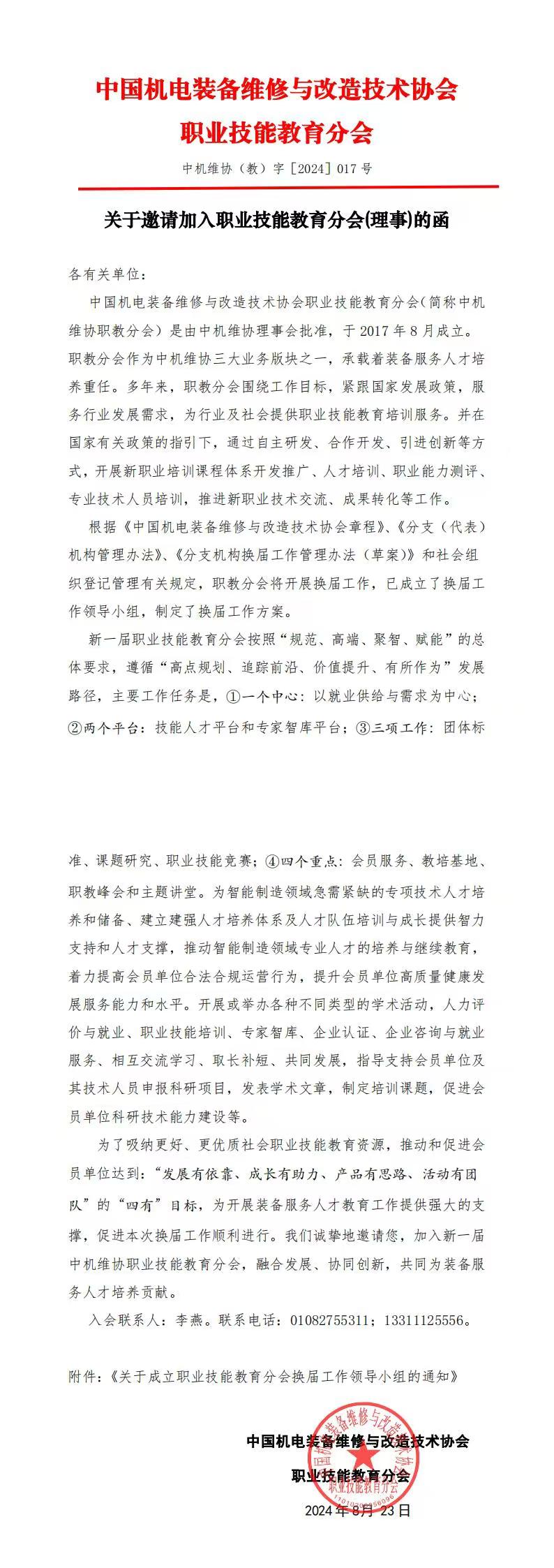 为了吸纳更好、更优质社会职业技能教育资源,推动和促进会员单位达到:“发展有依靠、成长有助力、产品有思路、活动有团队”的“四有”目标,为开展装备服务人才教育工作提供强大的支撑,促进本次换届工作顺利进行。我们诚挚地邀请您,加入新一届中机维协职业技能教育分会,融合发展、协同创新,共同为装备服务人才培养贡献。