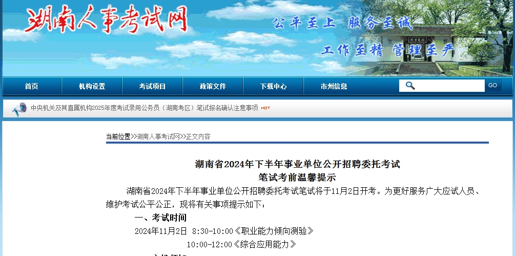 湖南省2024年下半年事业单位公开招聘委托考试笔试将于11月2日开考。为更好服务广大应试人员、维护考试公平公正,现将有关事项提示如下: