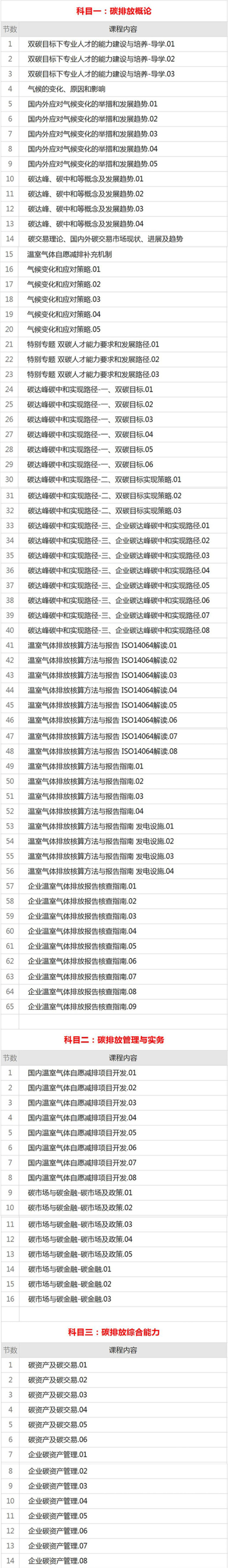 一、碳排放管理技术培训系列课程分为:《碳排放概论》、《碳排放管理与实务》、《碳排放综合能力》三个科目学习内容。